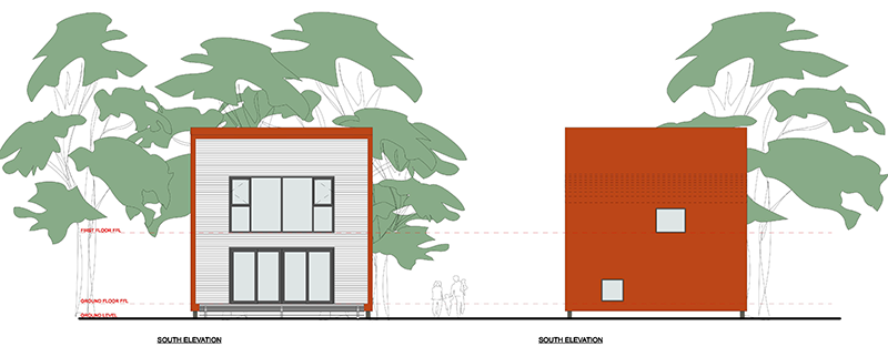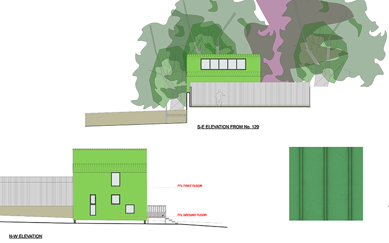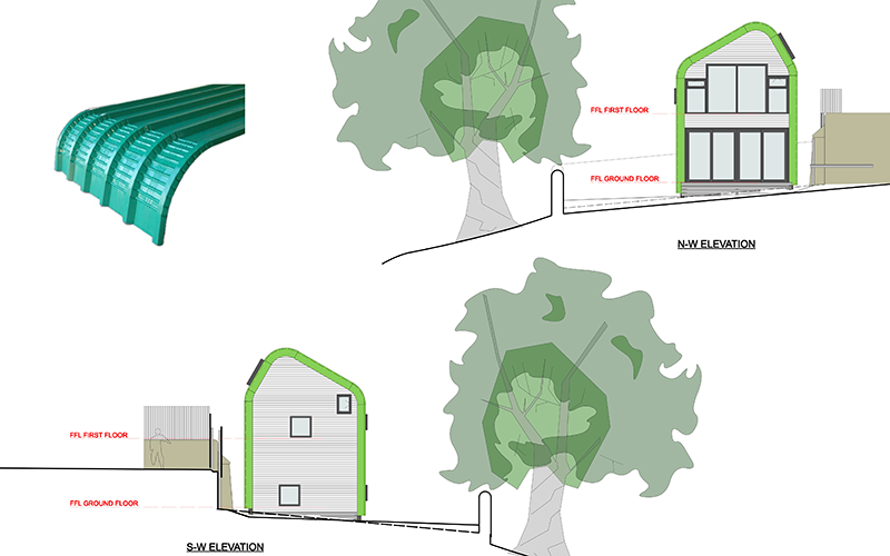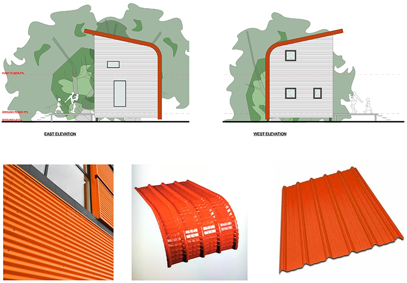 The north facing elevations are to be clad in brightly coloured profiled metal that wraps around and forms the roof. The other sides will be clad in untreated locally sourced larch with large windows and glazed doors to the South.